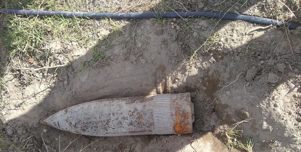 La ojiva es un explosivo de uso militar de alto poder. Es el proyectil más grande hallado hasta ahora. El vecino lo encontró cuando realizaba canales de riego en su lote.