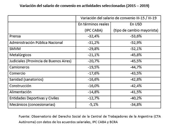 “Como puede observarse a simple vista, no solo estamos frente a un deterioro brutal del salario real, que en algunos casos muestra caídas superiores al 30% en cuatro años, sino una licuación de su valor en términos de moneda dura que supera en mucho a dicha variación”.